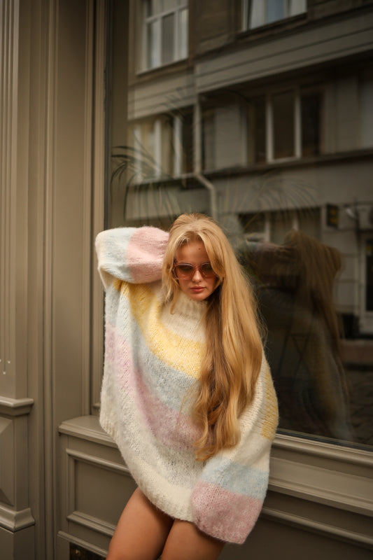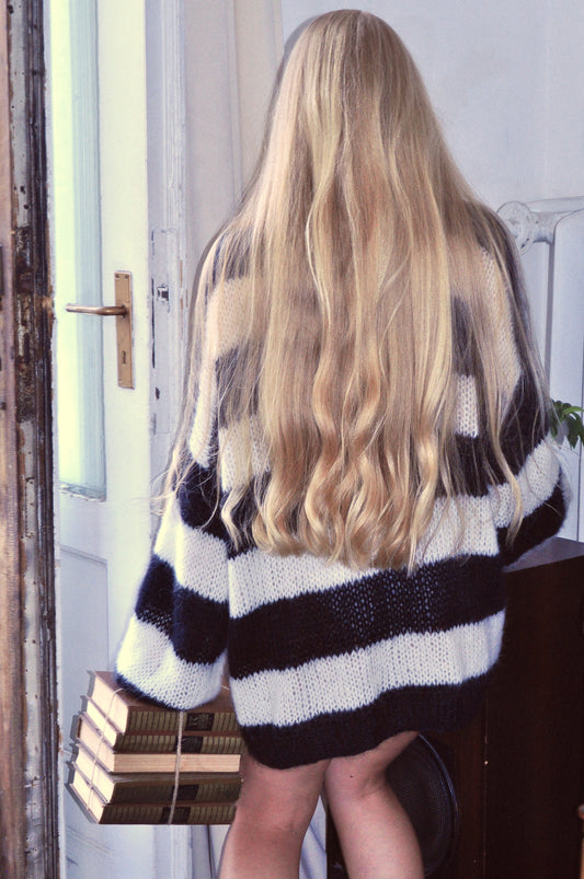 Handmade Oversized Beige & White Striped Mohair Pullover