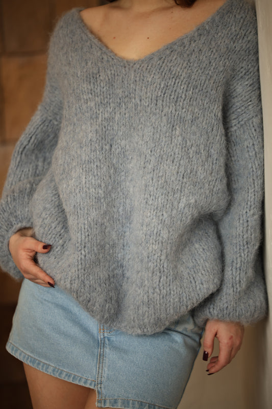 Luxurious Handmade Women’s Oversized V-Neck Sweater in Cloud Blue