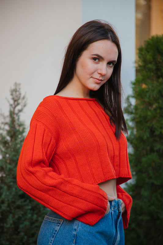 Elegant Cropped Handmade Sweater, Merino Wool and Cashmere Blend